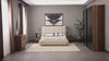 🔹 Confort și funcționalitate – patul dispune de ladă de depozitare integrată, ideală pentru organizarea eficientă a spațiului. Noptierele cu design geometric sculptat din lemn natural adaugă textură și eleganță, iar dulapul cu uși glisante din sticlă fumurie oferă un spațiu generos și practic pentru garderobă.